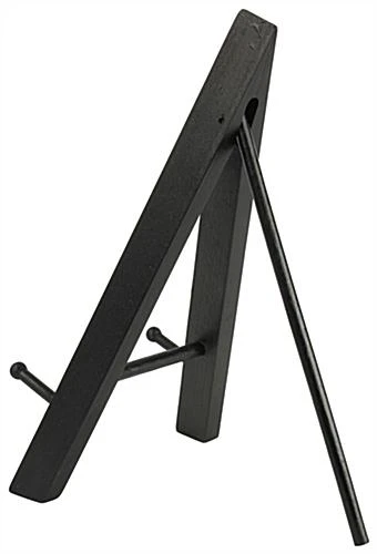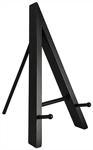 This tabletop easel, called a countertop display, is made for small art canvases, books, paintings, and collectors plates. These artist stands can be used on counters, mantels, exhibit tables, desks, or shelves. Each black wooden tabletop easel has 1-1/4″ pegs for showcasing items up to 1 lb. in weight. These display stands for art work are fully assembled, so consumers just need to remove them from the box and they are ready to use. This tabletop easel folds for easy storage and travel. When collapsed this artist display is only 2-1/4″ thick. Each tabletop easel is also lightweight for portability. Many consumers prefer these small artist stands for events where they do not need to display a huge item. This art holder is a tabletop easel that is great for business use, as well as homes or offices. This painting display is made of solid wood so they are sure to last a long time. There are many tabletop easel units on the market made out acrylic and metal, but nothing compares to the elegant look and high quality of a wooden art display. Most consumers prefer the wood units also do to the folding feature; most other stands are unable to collapse.