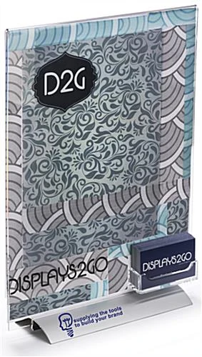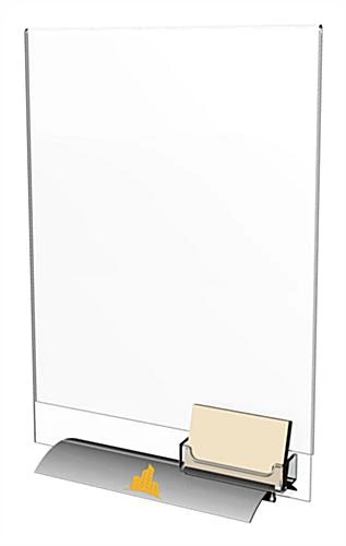 This vertical 11” x 14” signage frame with custom logo includes a business card pocket. Also great for holding gift cards, this office display captures the attention of customers with its large poster area. Made from clear acrylic, this business signage frame features a silver snap base with an attractive design. This construction allows the unit to disassemble for storage and travel. Each signage frame includes custom vinyl printing so businesses may add their logos to the display. From trade shows to doctor’s offices, these acrylic office sign products are sure to impress with their design and function.
