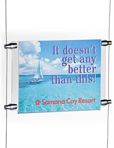This sign frame that is made of 1/8″ thick acrylic will provide a lasting display. Quickly switch out flyers with this poster holder. This sign frame that holds 11″w x 8-1/2″h graphics can be combined with other size holders when making a cable display system. This panel holds inserts in landscape orientation only. This displays can be mounted onto a cable system and hung virtually anywhere to advertise where needed. This acrylic sign frame is in stock now so order today!