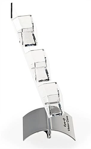 This 3-pocket card display with printed logo is a versatile way to promote your company. Whether you’re looking for a high quality counter stand for your retail store or an office accessory, the clear acrylic and silver aluminum base will match any décor while standing out to customers and visitors. You can easily place your custom gift certificates or contact information in the business card display, which has 3 open pockets for easy restocking. The slant back design of the holder allows for anyone to easily see its contents at the counter. If you ever need to store the card display, the snap-open base can be easily detached from the acrylic frame for convenient storage and clips back into place when in use. As a custom option, your company logo can be printed along the base, with 10 available colors for a high quality vinyl engraving.