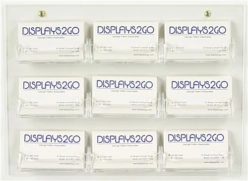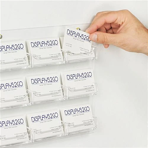This wall mounted business contacts display promotes goods and services in an office or retail showroom, freeing up counters and floors. Nine pockets give the user plenty of slots to store and dispense product or company information. Typically seen distributing credentials at automobile dealerships, eateries, convenience stores, and more, these acrylic card holders showcase multiple merchants’ phone numbers and addresses in an attractive wall case. This business contacts display, also known as a business info dispenser, is constructed of inexpensive plastic with a slight blue tint, hardly discernable from expensive conventional glass.