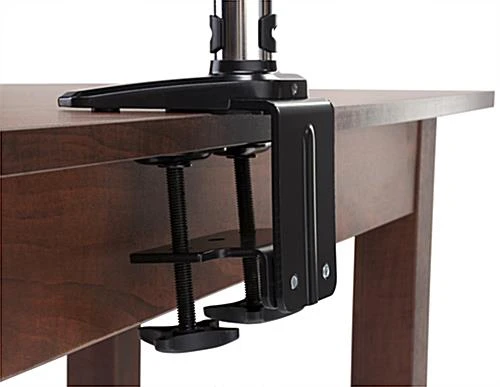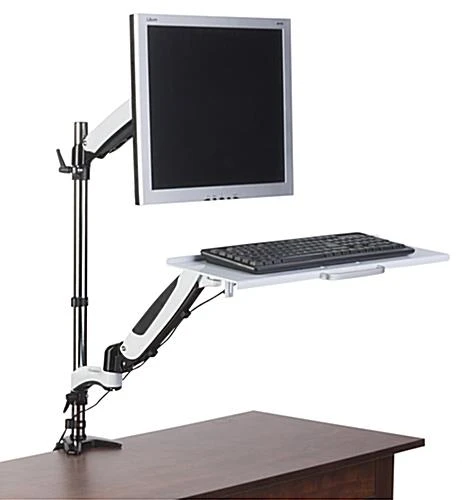 Featuring a tilting, swiveling, and rotating bracket, this monitor desk mount stand can adjust to meet your ergonomic needs. Aluminum construction provides a sturdy and fashionable design that can withstand long lasting daily use. Each VESA compliant monitor stand fits screens from most major television providers and comes with a clamp that tightens onto various sized tables and countertops. Quickly change from sitting to standing by lowering both the adjustable computer display bracket and keyboard tray to a desired height. The monitor stand can fit screens ranging from 15” to 27” weighing up to 17 pounds! Clamp this adjustable computer workstation in your office, warehouse, or medical facility to increase productivity and reduce strain on your neck and back.